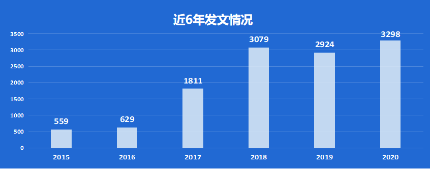 Frontiers in Immunology近6年发文量整体呈上升趋势,2015年与2016年仅五六百篇,2017年开始有明显的扩篇,发文量接近2千篇,2018年开始年均发文量3千篇左右,发文量比较大;综述类年均发文占比为35%左右,综述类占比较多;2020年国人发文占比为20.83%,国人发文占比相对较多。